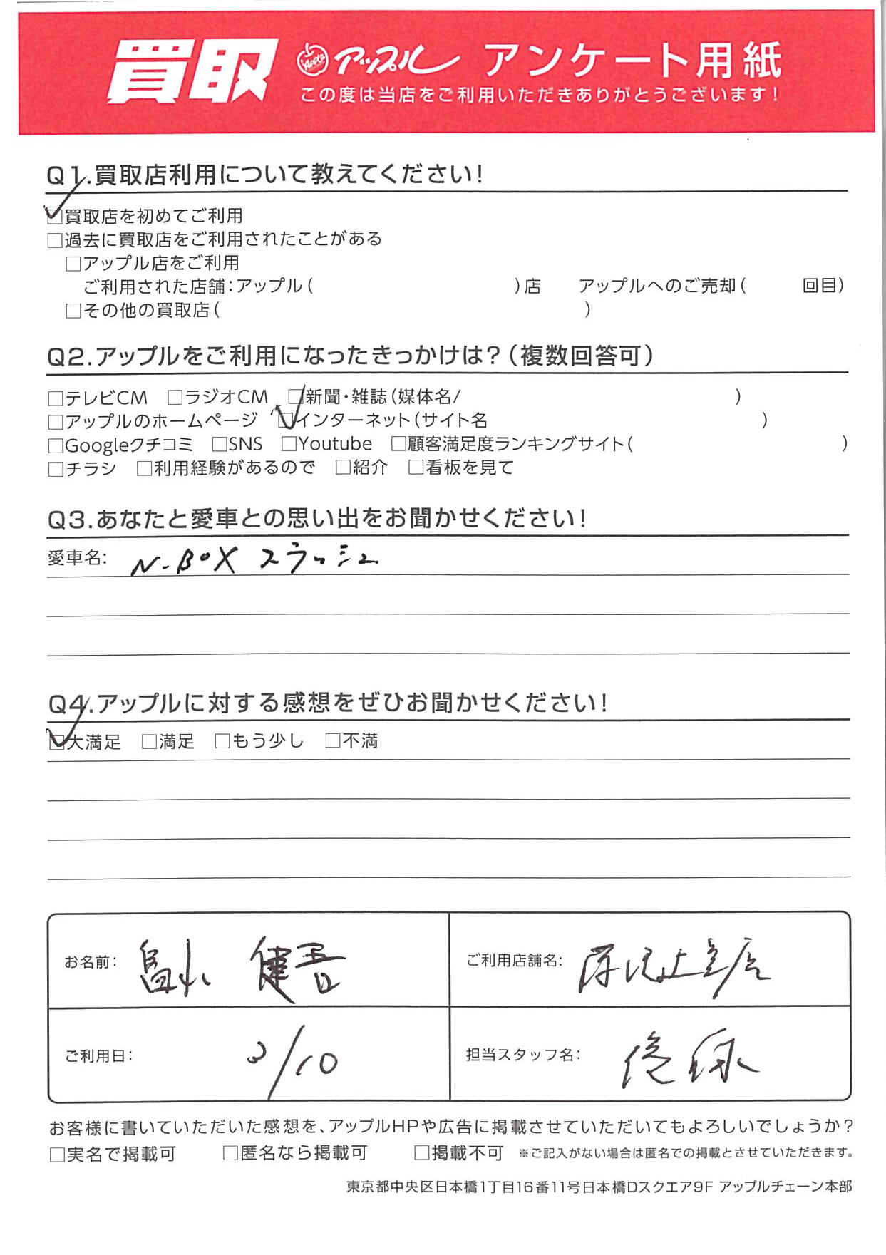 お車のご相談・ 査定だけでもOK! カンタン 入力 30秒 アップルがブランド買取始めました! お電話でも受付中! 受付時間10:00 ~ 18:30 0120-974-899 お車のご相談・ 査定だけでもOK! カンタン 入力 30秒 アップルがブランド買取始めました! お電話でも受付中! 受付時間10:00 ~ 18:30 0120-974-899 アップルがブランド買取始めました! お電話でも受付中! 受付時間10:00 ~ 18:30 0120-974-899 店舗情報 在庫車 スタッフ紹介 ブログ お客様の声 キャンペーン お得 無料査定 click お客様の声 ご記入日: 2022/03/10 H様 車名:ホンダ N-BOXスラッシュ Q.アップルに対する感想をぜひお聞かせください!A.大満足担当:後藤 前へ 次へ お客様の声一覧を見る