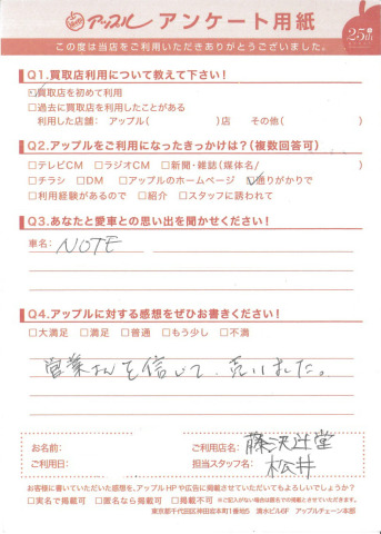 お車のご相談・ 査定だけでもOK! カンタン 入力 30秒 アップルがブランド買取始めました! お電話でも受付中! 受付時間10:00 ~ 18:30 0120-974-899 お車のご相談・ 査定だけでもOK! カンタン 入力 30秒 アップルがブランド買取始めました! お電話でも受付中! 受付時間10:00 ~ 18:30 0120-974-899 アップルがブランド買取始めました! お電話でも受付中! 受付時間10:00 ~ 18:30 0120-974-899 店舗情報 在庫車 スタッフ紹介 ブログ お客様の声 キャンペーン お得 無料査定 click お客様の声 ご記入日: 2014/09/06 I様 Q.アップルの感想は? 営業さんを信じて売りました。 前へ 次へ お客様の声一覧を見る