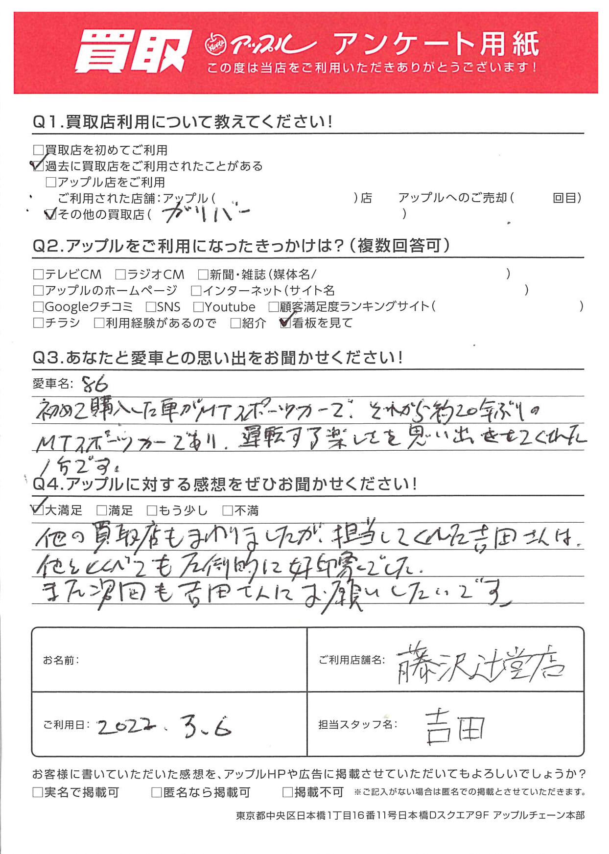 A.他の買取店もまわりましたが、担当してくれた吉田さんは、他と比べても