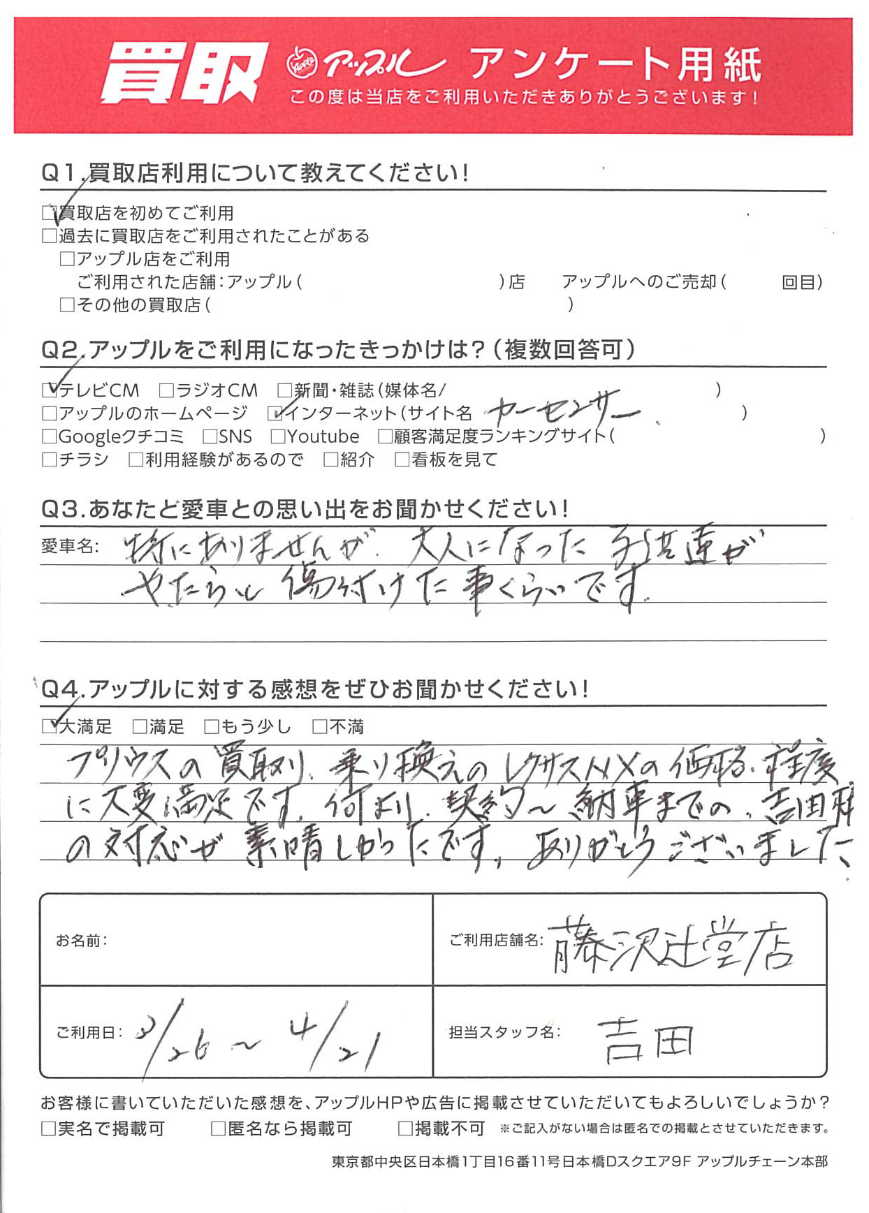 大変満足です。何より、契約~納車までの吉田様の対応が