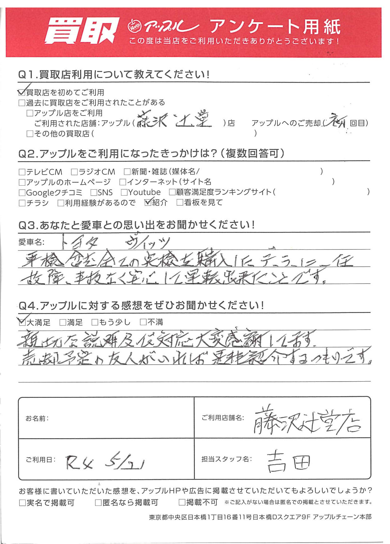 お車のご相談・ 査定だけでもOK! カンタン 入力 30秒 アップルがブランド買取始めました! お電話でも受付中! 受付時間10:00 ~ 18:30 0120-974-899 お車のご相談・ 査定だけでもOK! カンタン 入力 30秒 アップルがブランド買取始めました! お電話でも受付中! 受付時間10:00 ~ 18:30 0120-974-899 アップルがブランド買取始めました! お電話でも受付中! 受付時間10:00 ~ 18:30 0120-974-899 店舗情報 在庫車 スタッフ紹介 ブログ お客様の声 キャンペーン お得 無料査定 click お客様の声 ご記入日: 2022/05/21 T様 車名:トヨタ ヴィッツ Q.あなたと愛車との思い出をお聞かせください!A.車検含む全ての点検を購入したディーラーに一任。 故障、事故なく安心して運転出来たことです。Q.アップルに対する感想をぜひお聞かせください!A.親切な説明及び対応大変感謝してます。 売却予定の友人がいれば是非紹介するつもりです。担当:吉田 前へ 次へ お客様の声一覧を見る