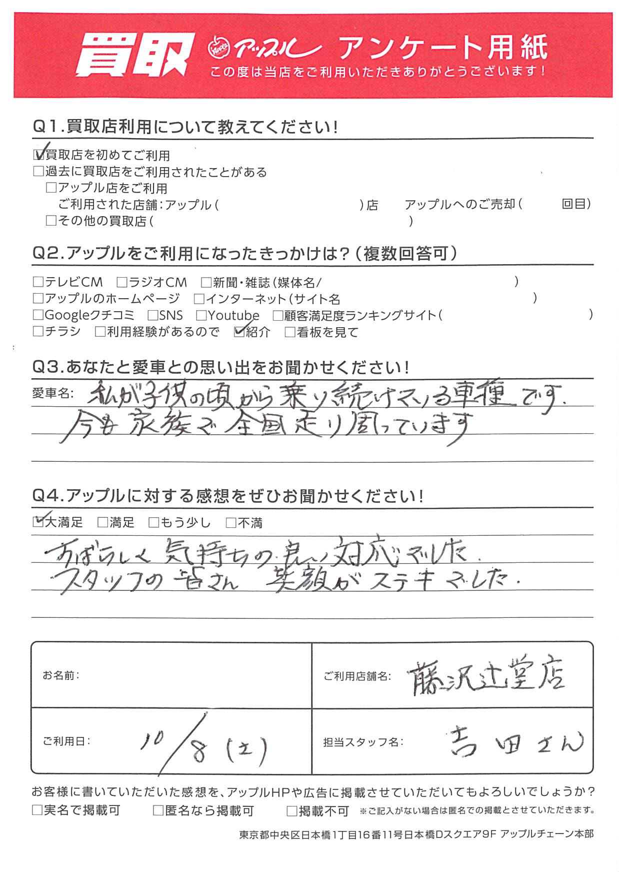 お車のご相談・ 査定だけでもOK! カンタン 入力 30秒 アップルがブランド買取始めました! お電話でも受付中! 受付時間10:00 ~ 18:30 0120-974-899 お車のご相談・ 査定だけでもOK! カンタン 入力 30秒 アップルがブランド買取始めました! お電話でも受付中! 受付時間10:00 ~ 18:30 0120-974-899 アップルがブランド買取始めました! お電話でも受付中! 受付時間10:00 ~ 18:30 0120-974-899 店舗情報 在庫車 スタッフ紹介 ブログ お客様の声 キャンペーン お得 無料査定 click お客様の声 ご記入日: 2022/10/08 N様 Q.あなたと愛車との思い出をお聞かせください!A.私が子供の頃から乗り続けている車種です。 今も家族で全国走り周っています。Q.アップルに対する感想をぜひお聞かせください!A.すばらしく気持ちの良い対応でした。 スタッフの皆さん笑顔がステキでした。担当:吉田 前へ 次へ お客様の声一覧を見る