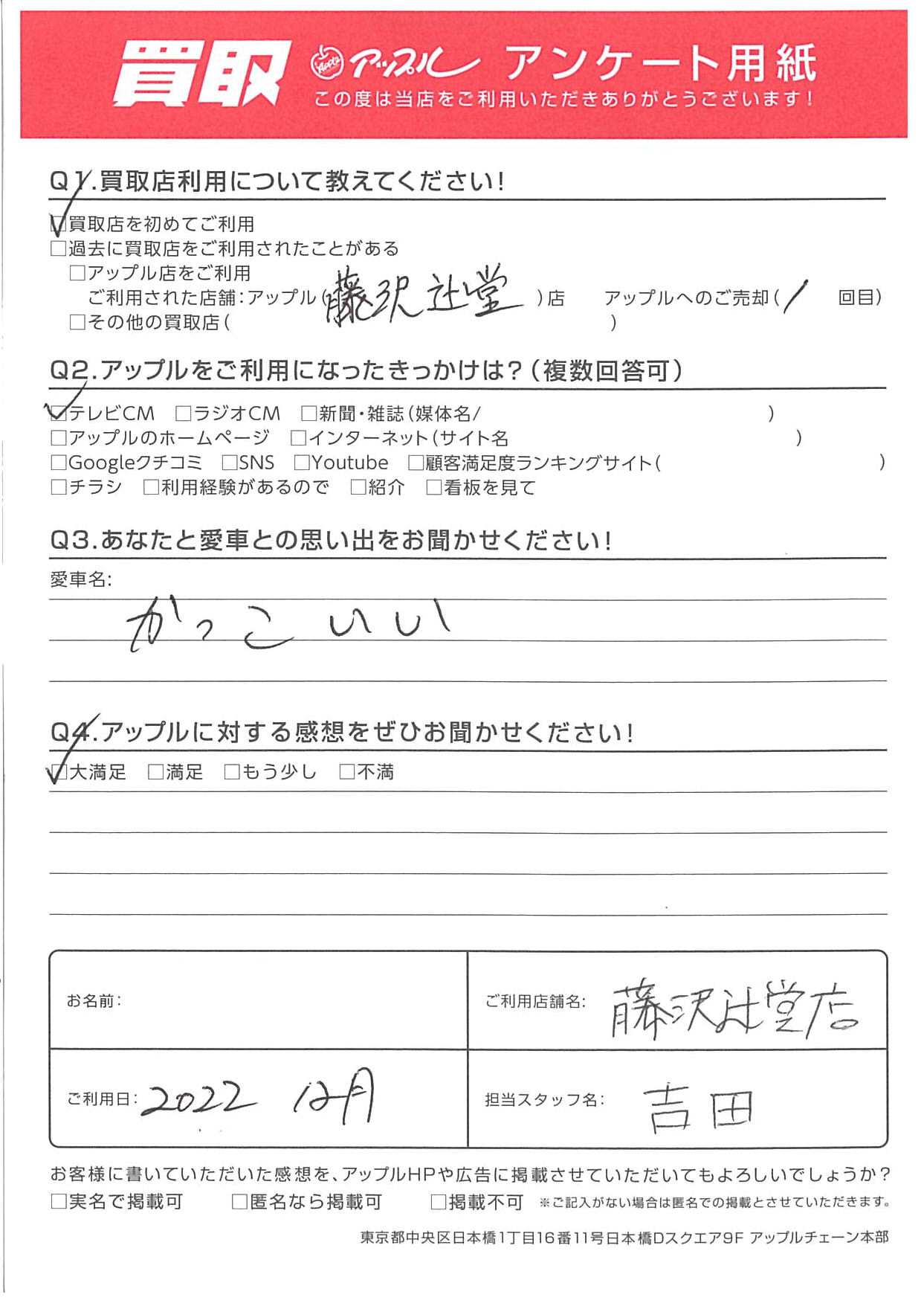 お車のご相談・ 査定だけでもOK! カンタン 入力 30秒 アップルがブランド買取始めました! お電話でも受付中! 受付時間10:00 ~ 18:30 0120-974-899 お車のご相談・ 査定だけでもOK! カンタン 入力 30秒 アップルがブランド買取始めました! お電話でも受付中! 受付時間10:00 ~ 18:30 0120-974-899 アップルがブランド買取始めました! お電話でも受付中! 受付時間10:00 ~ 18:30 0120-974-899 店舗情報 在庫車 スタッフ紹介 ブログ お客様の声 キャンペーン お得 無料査定 click お客様の声 ご記入日: 2022/12/15 O様 Q.あなたと愛車との思い出をお聞かせください!A.かっこいいQ.アップルに対する感想をぜひお聞かせください!A.大満足担当:吉田 前へ 次へ お客様の声一覧を見る