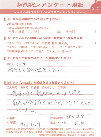 お車のご相談・ 査定だけでもOK! カンタン 入力 30秒 アップルがブランド買取始めました! お電話でも受付中! 受付時間10:00 ~ 18:30 0120-974-899 お車のご相談・ 査定だけでもOK! カンタン 入力 30秒 アップルがブランド買取始めました! お電話でも受付中! 受付時間10:00 ~ 18:30 0120-974-899 アップルがブランド買取始めました! お電話でも受付中! 受付時間10:00 ~ 18:30 0120-974-899 店舗情報 在庫車 スタッフ紹介 ブログ お客様の声 キャンペーン お得 無料査定 click お客様の声 ご記入日: 2015/05/01 O様 お車:マーチQ.愛車との思い出は?A.初めての自分の車でした。Q.アップルの感想は?A.担当の方が親切でそこは大満足。最初の価格表示が不能ででてきたのがマイナス点。 前へ 次へ お客様の声一覧を見る