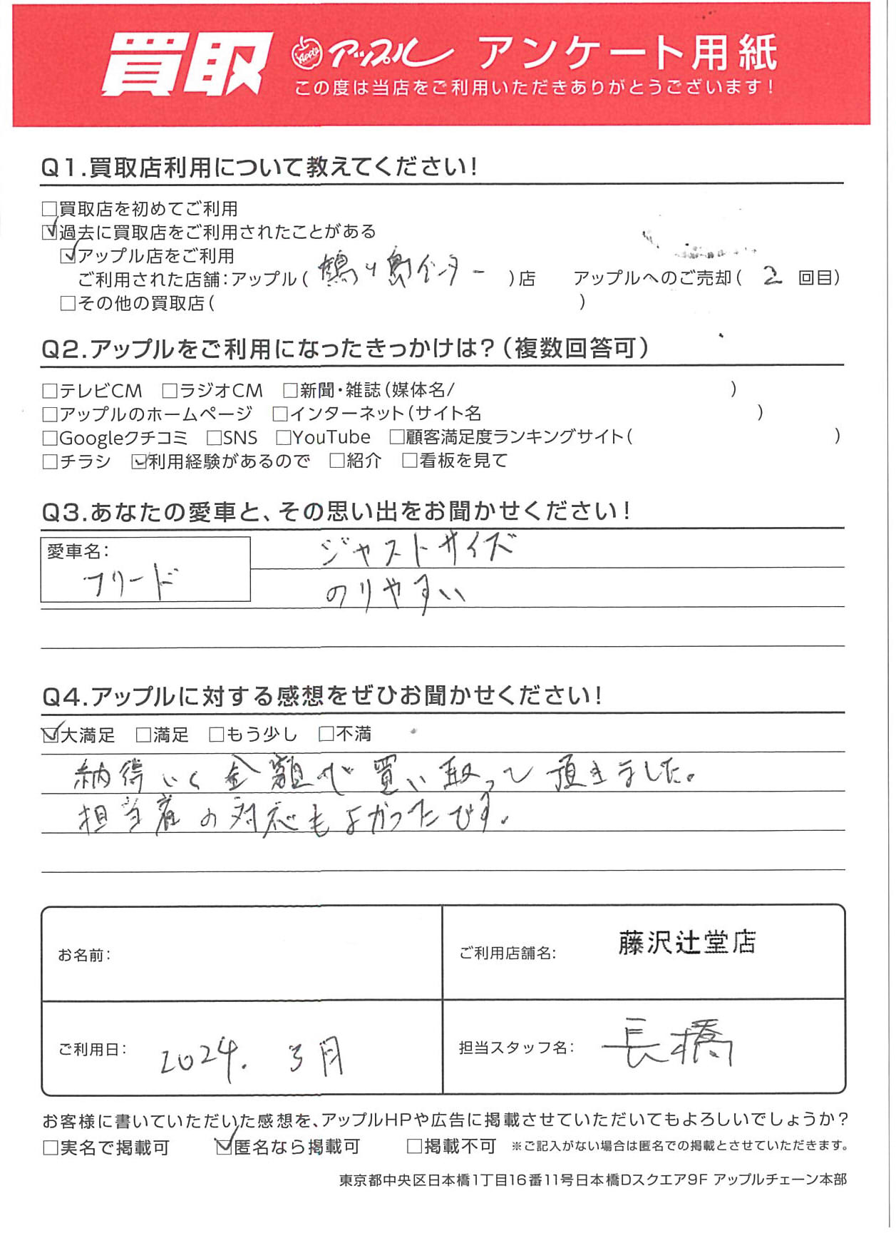 お車のご相談・ 査定だけでもOK! カンタン 入力 30秒 アップルがブランド買取始めました! お電話でも受付中! 受付時間10:00 ~ 18:30 0120-974-899 お車のご相談・ 査定だけでもOK! カンタン 入力 30秒 アップルがブランド買取始めました! お電話でも受付中! 受付時間10:00 ~ 18:30 0120-974-899 アップルがブランド買取始めました! お電話でも受付中! 受付時間10:00 ~ 18:30 0120-974-899 店舗情報 在庫車 スタッフ紹介 ブログ お客様の声 キャンペーン お得 無料査定 click お客様の声 ご記入日: 2024/03/01 匿名希望様 車名:ホンダ フリード(H28年9月以降のハイブリッド含む) Q.あなたと愛車との思い出をお聞かせください!A.ジャストサイズ のりやすいQ.アップルに対する感想をぜひお聞かせください!A.納得いく金額で買い取って頂きました。 担当の対応もよかったです。担当:長橋 前へ 次へ お客様の声一覧を見る