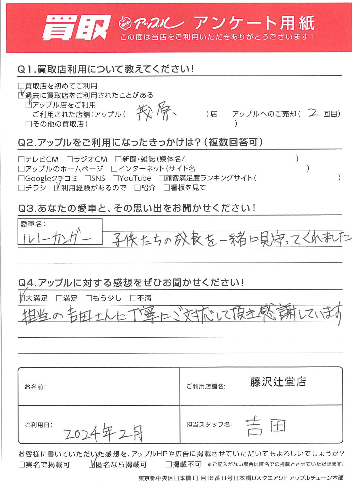 お車のご相談・ 査定だけでもOK! カンタン 入力 30秒 アップルがブランド買取始めました! お電話でも受付中! 受付時間10:00 ~ 18:30 0120-974-899 お車のご相談・ 査定だけでもOK! カンタン 入力 30秒 アップルがブランド買取始めました! お電話でも受付中! 受付時間10:00 ~ 18:30 0120-974-899 アップルがブランド買取始めました! お電話でも受付中! 受付時間10:00 ~ 18:30 0120-974-899 店舗情報 在庫車 スタッフ紹介 ブログ お客様の声 キャンペーン お得 無料査定 click お客様の声 ご記入日: 2024/02/29 匿名希望様 車名:ルノー カングー Q.あなたと愛車との思い出をお聞かせください!A.子供たちの成長を一緒に見守ってくれましたQ.アップルに対する感想をぜひお聞かせください!A.担当の吉田さんに丁寧にご対応して頂き感謝しています担当:吉田 前へ 次へ お客様の声一覧を見る