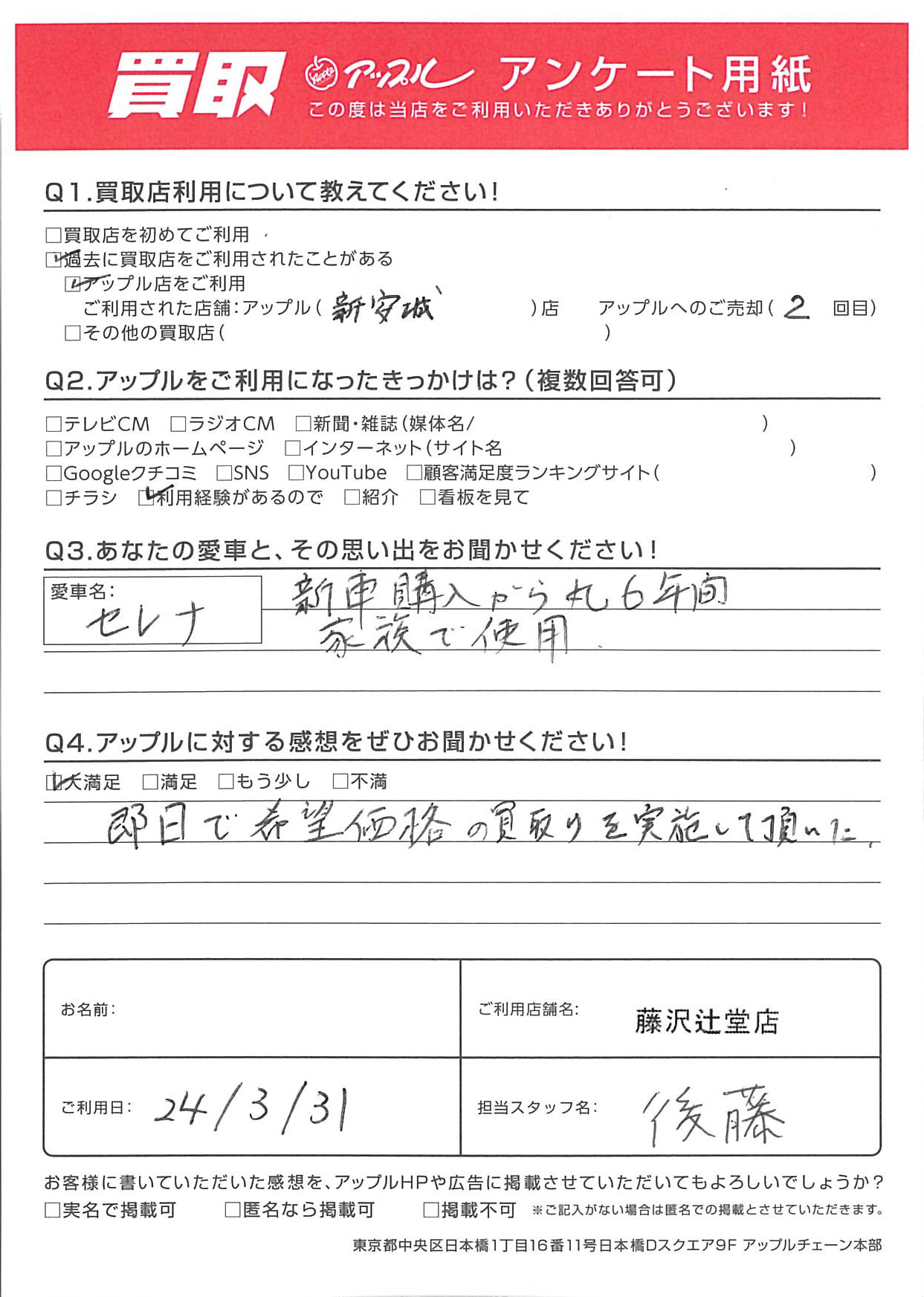 お車のご相談・ 査定だけでもOK! カンタン 入力 30秒 アップルがブランド買取始めました! お電話でも受付中! 受付時間10:00 ~ 18:30 0120-974-899 お車のご相談・ 査定だけでもOK! カンタン 入力 30秒 アップルがブランド買取始めました! お電話でも受付中! 受付時間10:00 ~ 18:30 0120-974-899 アップルがブランド買取始めました! お電話でも受付中! 受付時間10:00 ~ 18:30 0120-974-899 店舗情報 在庫車 スタッフ紹介 ブログ お客様の声 キャンペーン お得 無料査定 click お客様の声 ご記入日: 2024/03/31 H様 車名:日産 セレナ Q.あなたと愛車との思い出をお聞かせください!A.新車購入から丸6年間家族で使用Q.アップルに対する感想をぜひお聞かせください!A.即日で希望価格の買取りを実施して頂いた担当:後藤 前へ 次へ お客様の声一覧を見る