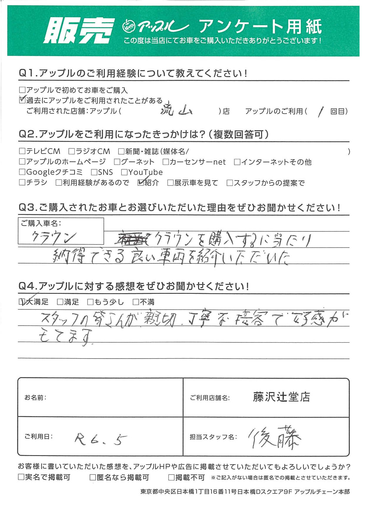お車のご相談・ 査定だけでもOK! カンタン 入力 30秒 アップルがブランド買取始めました! お電話でも受付中! 受付時間10:00 ~ 18:30 0120-974-899 お車のご相談・ 査定だけでもOK! カンタン 入力 30秒 アップルがブランド買取始めました! お電話でも受付中! 受付時間10:00 ~ 18:30 0120-974-899 アップルがブランド買取始めました! お電話でも受付中! 受付時間10:00 ~ 18:30 0120-974-899 店舗情報 在庫車 スタッフ紹介 ブログ お客様の声 キャンペーン お得 無料査定 click お客様の声 ご記入日: 2024/05/31 K様 車名:トヨタ クラウンクロスオーバー Q.ご購入されたお車を選んだ理由ををお聞かせください!A.クラウンを購入するに当たり納得できる良い車両を紹介いただいた。Q.アップルに対する感想をぜひお聞かせください!A.スタッフの皆さんが親切、丁寧な接客で好感がもてます。担当:後藤 前へ 次へ お客様の声一覧を見る