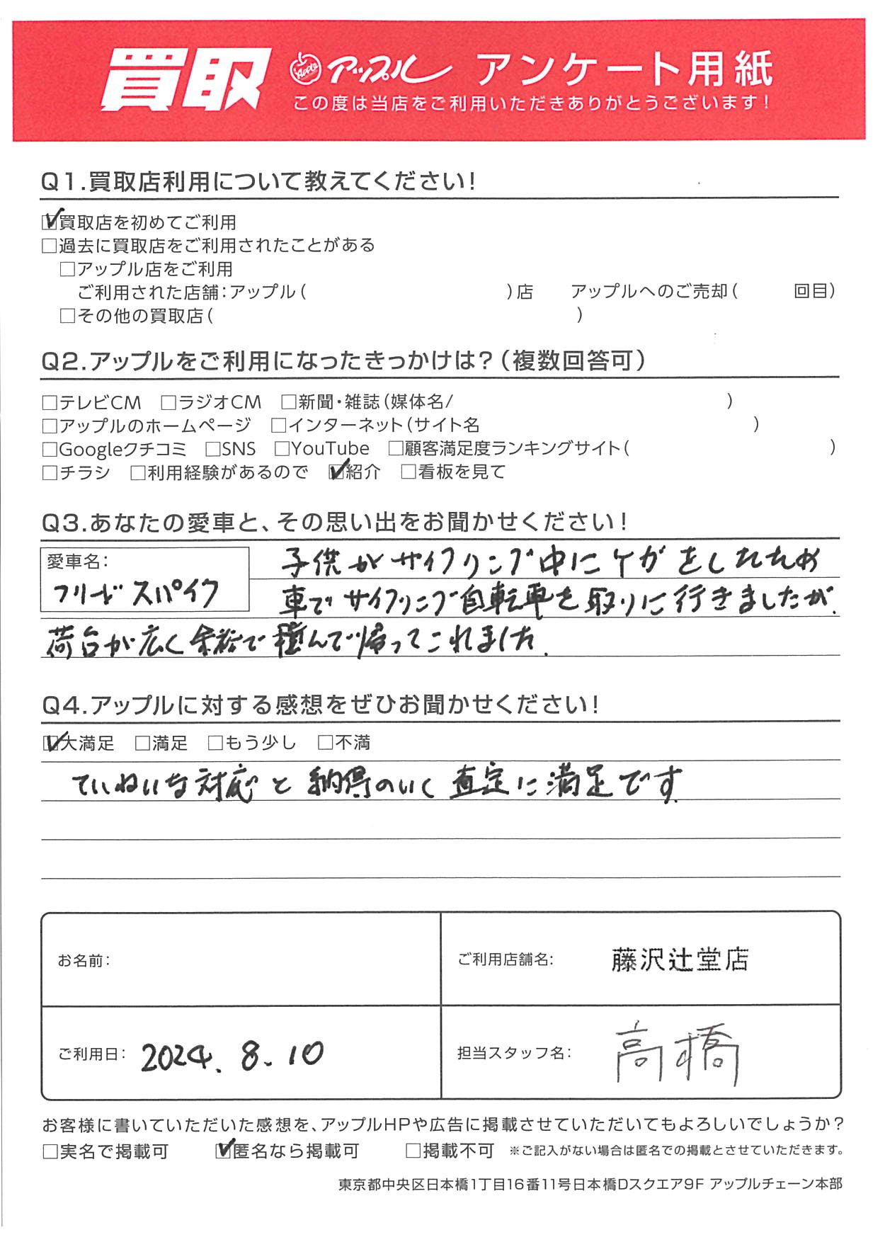 お車のご相談・ 査定だけでもOK! カンタン 入力 30秒 アップルがブランド買取始めました! お電話でも受付中! 受付時間10:00 ~ 18:30 0120-974-899 お車のご相談・ 査定だけでもOK! カンタン 入力 30秒 アップルがブランド買取始めました! お電話でも受付中! 受付時間10:00 ~ 18:30 0120-974-899 アップルがブランド買取始めました! お電話でも受付中! 受付時間10:00 ~ 18:30 0120-974-899 店舗情報 在庫車 スタッフ紹介 ブログ お客様の声 キャンペーン お得 無料査定 click お客様の声 ご記入日: 2024/08/10 匿名希望様 車名:ホンダ フリードスパイク Q.愛車とその思い出をお聞かせください!A.子供がサイクリング中にケガをしたため車でサイクリング 自転車を取りに行きましたが、荷台が高く広く余裕で積んで 帰ってこれました。Q.アップルに対する感想をぜひお聞かせください!A.ていねいな対応と納得のいく査定に満足です。担当:高橋 前へ 次へ お客様の声一覧を見る