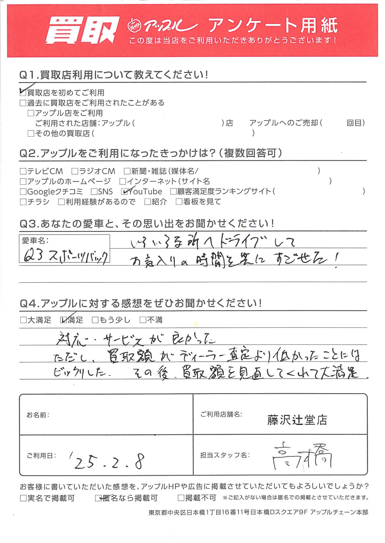 ただし、買取額がディーラー査定より低かったことには