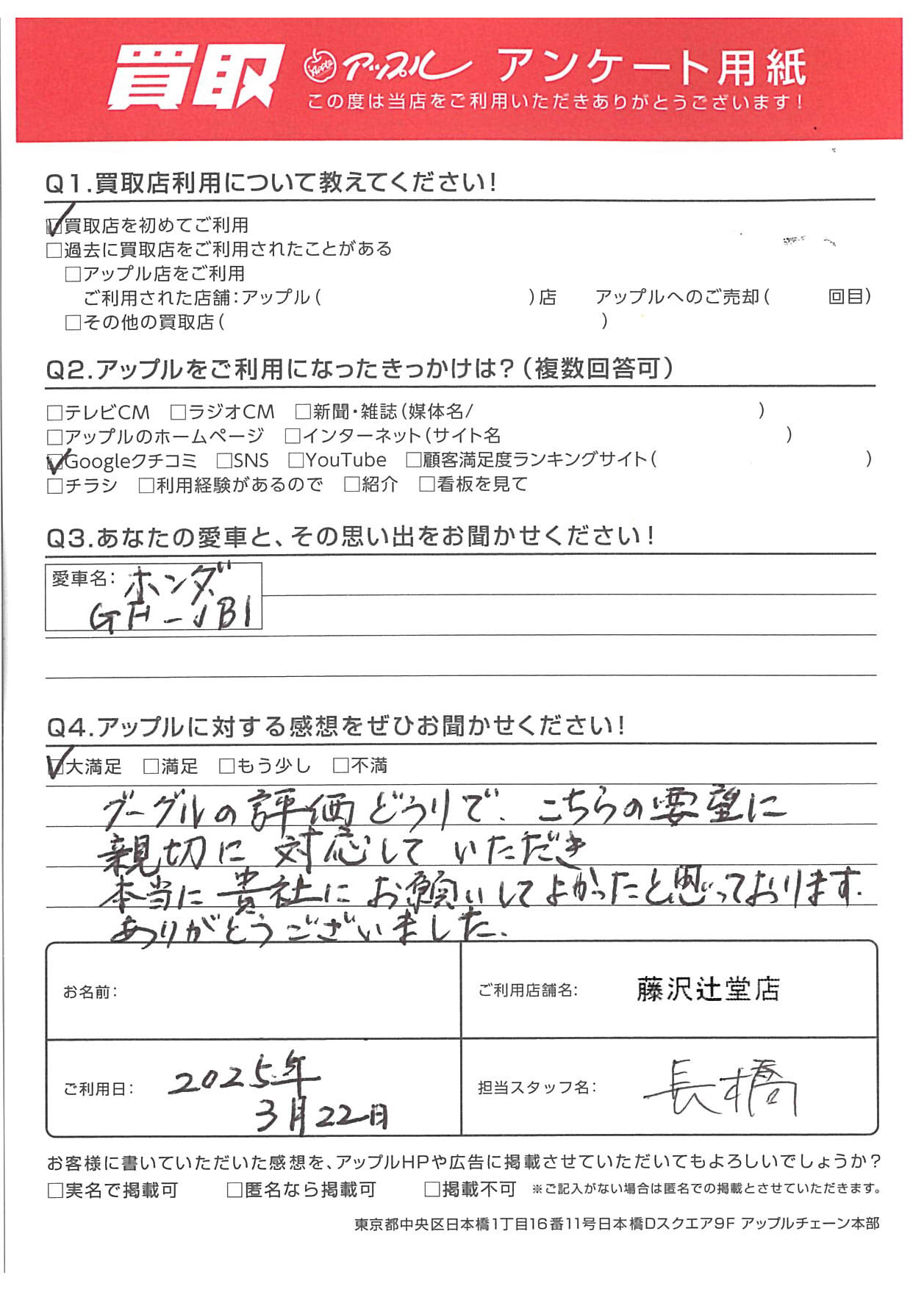 お車のご相談・ 査定だけでもOK! カンタン 入力 30秒 アップルがブランド買取始めました! お電話でも受付中! 受付時間10:00 ~ 18:30 0120-974-899 お車のご相談・ 査定だけでもOK! カンタン 入力 30秒 アップルがブランド買取始めました! お電話でも受付中! 受付時間10:00 ~ 18:30 0120-974-899 アップルがブランド買取始めました! お電話でも受付中! 受付時間10:00 ~ 18:30 0120-974-899 店舗情報 在庫車 スタッフ紹介 ブログ お客様の声 キャンペーン お得 無料査定 click お客様の声 ご記入日: 2025/03/22 O様 車名:ホンダ ライフ Q.アップルに対する感想をぜひお聞かせください!A.グーグルの評価どうりで、こちらの要望に親切に 対応していただき本当に貴社にお願いしてよかったと 思っております。ありがとうございました。担当:長橋 前へ 次へ お客様の声一覧を見る