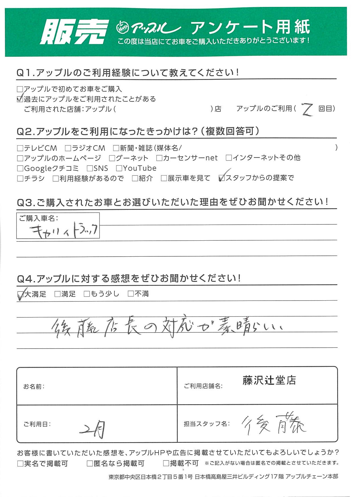 お車のご相談・ 査定だけでもOK! カンタン 入力 30秒 アップルがブランド買取始めました! お電話でも受付中! 受付時間10:00 ~ 18:30 0120-974-899 お車のご相談・ 査定だけでもOK! カンタン 入力 30秒 アップルがブランド買取始めました! お電話でも受付中! 受付時間10:00 ~ 18:30 0120-974-899 アップルがブランド買取始めました! お電話でも受付中! 受付時間10:00 ~ 18:30 0120-974-899 店舗情報 在庫車 スタッフ紹介 ブログ お客様の声 キャンペーン お得 無料査定 click お客様の声 ご記入日: 2026/02/09 M様 車名:スズキ キャリイ Q.アップルに対する感想をぜひお聞かせください!A.後藤店長の対応が素晴らしい担当:後藤 前へ 次へ お客様の声一覧を見る