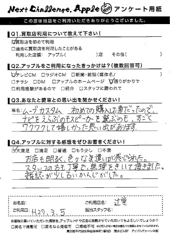 お車のご相談・ 査定だけでもOK! カンタン 入力 30秒 アップルがブランド買取始めました! お電話でも受付中! 受付時間10:00 ~ 18:30 0120-974-899 お車のご相談・ 査定だけでもOK! カンタン 入力 30秒 アップルがブランド買取始めました! お電話でも受付中! 受付時間10:00 ~ 18:30 0120-974-899 アップルがブランド買取始めました! お電話でも受付中! 受付時間10:00 ~ 18:30 0120-974-899 店舗情報 在庫車 スタッフ紹介 ブログ お客様の声 キャンペーン お得 無料査定 click お客様の声 ご記入日: 2015/08/18 M様 お車:ムーヴカスタムQ.愛車との思い出は?A.初めての購入した車だったので、ナビをえらぶのもスピーカーを選ぶのも、すごくワクワクして嬉しかった思い出があります。Q.アップルの感想は?A.お店も明るく、色々な気遣いが感じられた。スタッフの方も丁寧で、無理をきいて頂きました。雑誌が古いかんじがした。 前へ 次へ お客様の声一覧を見る