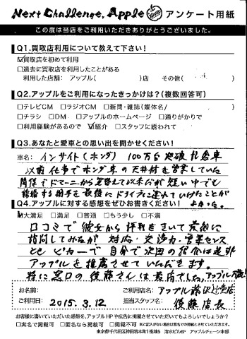A.口コミで彼女から評判をきいて最初に訪問してみたが対応・交渉力・営業センスともピカイチで自分で次回の紹介は是非アップルを推薦させていただきます。特に窓口の後藤さんは最高でした。アップル万歳!