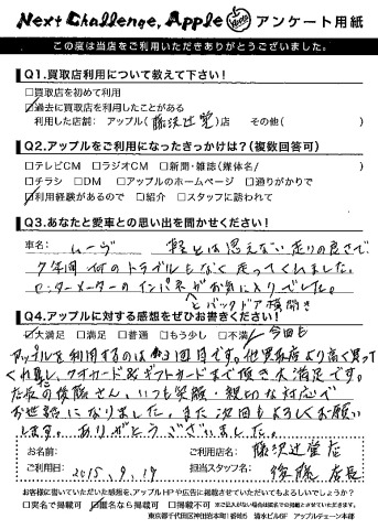 A.アップルを利用するのは3回目です。今回も他買取店より高く買ってくれたし、クオカード&ギフトカードまで頂き大満足です。店長の後藤さん、いつも笑顔・親切な対応でお世話になりました。また次回もよろしくお願いします。ありがとうございました。