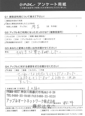 お車のご相談・ 査定だけでもOK! カンタン 入力 30秒 アップルがブランド買取始めました! お電話でも受付中! 受付時間10:00 ~ 18:30 0120-974-899 お車のご相談・ 査定だけでもOK! カンタン 入力 30秒 アップルがブランド買取始めました! お電話でも受付中! 受付時間10:00 ~ 18:30 0120-974-899 アップルがブランド買取始めました! お電話でも受付中! 受付時間10:00 ~ 18:30 0120-974-899 店舗情報 在庫車 スタッフ紹介 ブログ お客様の声 キャンペーン お得 無料査定 click お客様の声 ご記入日: 2016/06/06 M様 愛車との思い出は?大好きな車でした。アップルの感想は?ていねいな対応をしてくださいました。値段もそうですが人柄で決めました。 前へ 次へ お客様の声一覧を見る