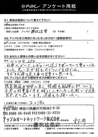 お車のご相談・ 査定だけでもOK! カンタン 入力 30秒 アップルがブランド買取始めました! お電話でも受付中! 受付時間10:00 ~ 18:30 0120-974-899 お車のご相談・ 査定だけでもOK! カンタン 入力 30秒 アップルがブランド買取始めました! お電話でも受付中! 受付時間10:00 ~ 18:30 0120-974-899 アップルがブランド買取始めました! お電話でも受付中! 受付時間10:00 ~ 18:30 0120-974-899 店舗情報 在庫車 スタッフ紹介 ブログ お客様の声 キャンペーン お得 無料査定 click お客様の声 ご記入日: 2016/09/20 K様 愛車との思い出は?仕事にゴルフ、レジャーに遠くまでいろいろ乗せてくれました。思い出が詰まったドライブ生活でした。まだまだ倍は走る事は出来ると思います。アップルの感想は?接客態度が非常に良く、説明も的確に行っている。お店の従業員の方も明るくハキハキした感じで大変良かったと思います。次回もお願いしたい。 前へ 次へ お客様の声一覧を見る