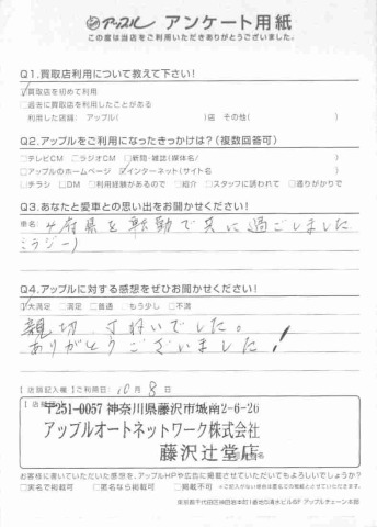 お車のご相談・ 査定だけでもOK! カンタン 入力 30秒 アップルがブランド買取始めました! お電話でも受付中! 受付時間10:00 ~ 18:30 0120-974-899 お車のご相談・ 査定だけでもOK! カンタン 入力 30秒 アップルがブランド買取始めました! お電話でも受付中! 受付時間10:00 ~ 18:30 0120-974-899 アップルがブランド買取始めました! お電話でも受付中! 受付時間10:00 ~ 18:30 0120-974-899 店舗情報 在庫車 スタッフ紹介 ブログ お客様の声 キャンペーン お得 無料査定 click お客様の声 ご記入日: 2017/09/01 N様 お車:ミラジーノQ.愛車との思い出は?A.4府県を転勤で共に過ごしましたQ.アップルの感想は?A.親切、丁ねいでした。ありがとうございました! 前へ 次へ お客様の声一覧を見る