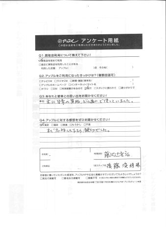 お車のご相談・ 査定だけでもOK! カンタン 入力 30秒 アップルがブランド買取始めました! お電話でも受付中! 受付時間10:00 ~ 18:30 0120-974-899 お車のご相談・ 査定だけでもOK! カンタン 入力 30秒 アップルがブランド買取始めました! お電話でも受付中! 受付時間10:00 ~ 18:30 0120-974-899 アップルがブランド買取始めました! お電話でも受付中! 受付時間10:00 ~ 18:30 0120-974-899 店舗情報 在庫車 スタッフ紹介 ブログ お客様の声 キャンペーン お得 無料査定 click お客様の声 ご記入日: 2018/05/22 D様 Q.あなたと愛車との思い出をお聞かせください!主に日常の買物、ジム通いで使っていました。Q.アップルに対する感想をぜひお書きください!すぐ応対して下さり、親切でした。担当スタッフ:後藤 前へ 次へ お客様の声一覧を見る