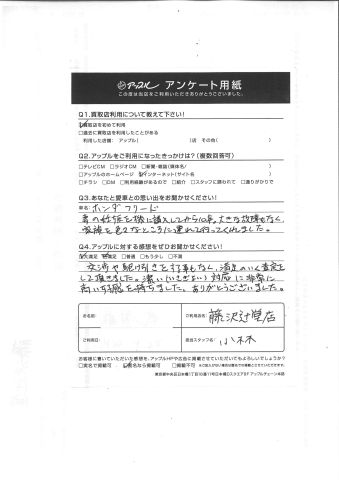 交渉や駆け引きをする事もなく、満足のいく査定をして頂きました。潔い(いさぎよい)対応に非常に高い好感を持ちました。ありがとうございました。