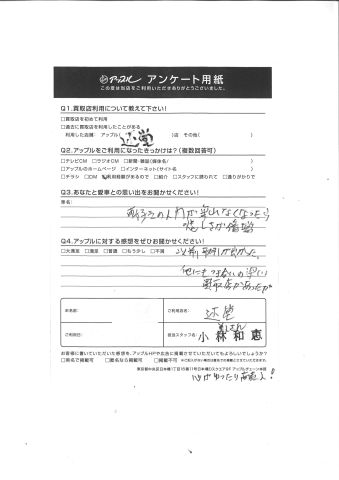 お車のご相談・ 査定だけでもOK! カンタン 入力 30秒 アップルがブランド買取始めました! お電話でも受付中! 受付時間10:00 ~ 18:30 0120-974-899 お車のご相談・ 査定だけでもOK! カンタン 入力 30秒 アップルがブランド買取始めました! お電話でも受付中! 受付時間10:00 ~ 18:30 0120-974-899 アップルがブランド買取始めました! お電話でも受付中! 受付時間10:00 ~ 18:30 0120-974-899 店舗情報 在庫車 スタッフ紹介 ブログ お客様の声 キャンペーン お得 無料査定 click お客様の声 ご記入日: 2018/09/18 S様 Q.あなたと愛車との思い出をお聞かせください!車好きの人間が乗れなくなったら悲しさが倍増Q.アップルに対する感想をぜひお書きください!以前、取引が良かった。他にもつき合いの深い買取店があったが。心がゆったり商売人!担当スタッフ:小林 前へ 次へ お客様の声一覧を見る