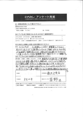 転居先がとても便が良く、かつ乗る機会もなくなってしまい実家に置いてきました。車検切れ、バッテリー上がりで自走不可。ネットで査定をお願いするも、ことごとく断られて困っていた所、アップルさんだけ唯一『もしよかったらお引取りはしますよ』と。そこからの対応はとてもすばらしく、とくに来て下さった方は『心遣い』が最高でした。それが社員教育の賜物であってもありがたかったです。