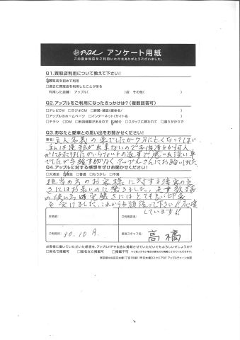 担当の方のお客様に対する接客の良さにはお若いのに驚きました。先ず敬語の使い方の完璧さにはとても良い印象を受けました。これからも頑張ってください!!応援しています!!