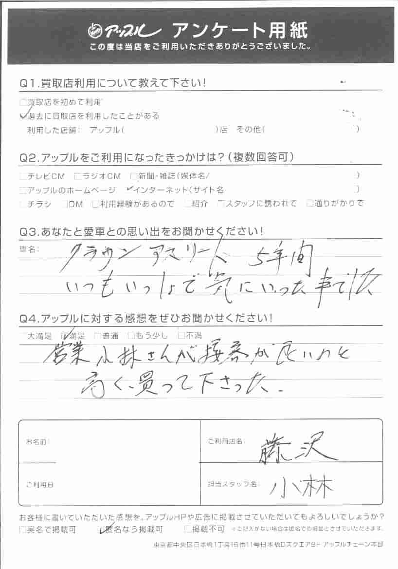 お車のご相談・ 査定だけでもOK! カンタン 入力 30秒 アップルがブランド買取始めました! お電話でも受付中! 受付時間10:00 ~ 18:30 0120-974-899 お車のご相談・ 査定だけでもOK! カンタン 入力 30秒 アップルがブランド買取始めました! お電話でも受付中! 受付時間10:00 ~ 18:30 0120-974-899 アップルがブランド買取始めました! お電話でも受付中! 受付時間10:00 ~ 18:30 0120-974-899 店舗情報 在庫車 スタッフ紹介 ブログ お客様の声 キャンペーン お得 無料査定 click お客様の声 ご記入日: 2019/04/06 H様 車名:トヨタ クラウンアスリート (H11年9月~H30年6月) Q.あなたと愛車との思い出をお聞かせください!5年間いつもいっしょで気にいった車でしたQ.アップルに対する感想をぜひお聞かせください!営業小林さんの接客が良いのと高く買って下さった担当スタッフ 小林 前へ 次へ お客様の声一覧を見る