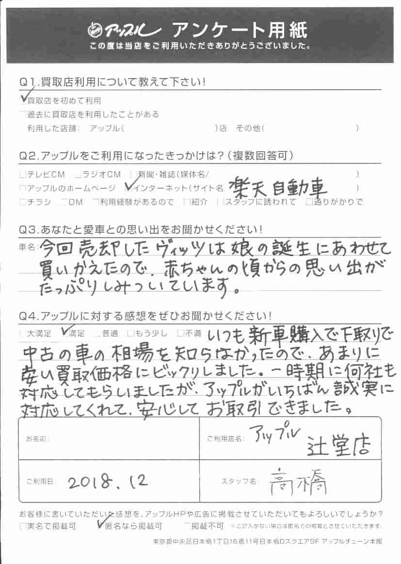 いつも新車購入で下取りで中古の車の相場を知らなかったので、あまりに安い買取価格にビックリしました。一時期に何社も対応してもりましたが、アップルがいちばん誠実に対応してくれて、安心してお取引できました。