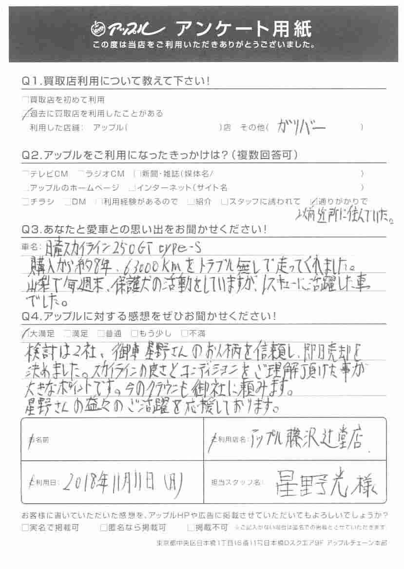 検討は2社、御社星野さんのお人柄を信頼し、即日売却を決めました。スカイラインの良さとコンディションをご理解頂けた事が大きなポイントです。今のクラウンも御社に頼みます。星野さんの益々のご活躍を応援しております。