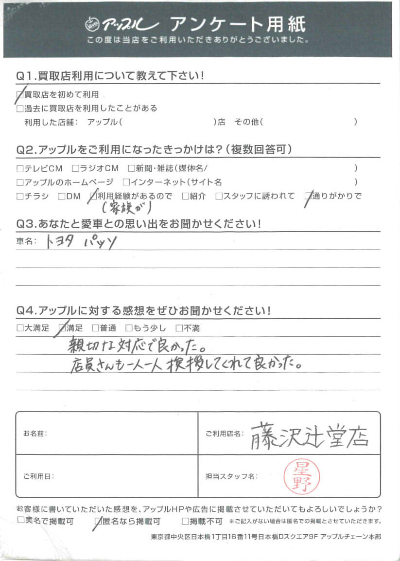 A.親切な対応で良かった。店員さんも一人一人挨拶してくれて良かった。