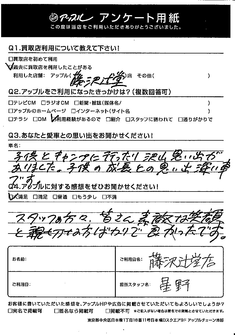 お車のご相談・ 査定だけでもOK! カンタン 入力 30秒 アップルがブランド買取始めました! お電話でも受付中! 受付時間10:00 ~ 18:30 0120-974-899 お車のご相談・ 査定だけでもOK! カンタン 入力 30秒 アップルがブランド買取始めました! お電話でも受付中! 受付時間10:00 ~ 18:30 0120-974-899 アップルがブランド買取始めました! お電話でも受付中! 受付時間10:00 ~ 18:30 0120-974-899 店舗情報 在庫車 スタッフ紹介 ブログ お客様の声 キャンペーン お得 無料査定 click お客様の声 ご記入日: -/-/- 匿名希望様 Q.あなたと愛車との思い出をお聞かせください!A.子供とキャンプに行ったり沢山思い出がありました 子供の成長との思い出深い車ですQ.アップルに対する感想をぜひお聞かせください!A.スタッフの方々、皆さん素敵な笑顔と親切な 方ばかりで良かったです。担当:星野 前へ 次へ お客様の声一覧を見る