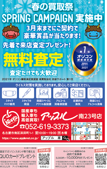 お車のご相談・ 査定だけでもOK! カンタン 入力 30秒 アップルがブランド買取始めました! お電話でも受付中! 受付時間10:00~19:00 052-619-3373 お車のご相談・ 査定だけでもOK! カンタン 入力 30秒 アップルがブランド買取始めました! お電話でも受付中! 受付時間10:00~19:00 052-619-3373 アップルがブランド買取始めました! お電話でも受付中! 受付時間10:00~19:00 052-619-3373 店舗情報 在庫車 スタッフ紹介 ブログ お客様の声 キャンペーン 無料査定 click [ つぶやき ] 2022/01/28 (金) 14:44 オトクの宝石箱や~(∩´∀`)∩ 本日も元気に営業中です!なかなかいい顔の写真が撮れました。スタッフ北川さんの写真ハンター兼店長の松下です。(^◇^)いまアップルはご存じの通りキャンペーン中(∩´∀`)∩何度もご案内しておりますが(/o\)簡単に言うとプレゼントがもらえて買取価格もお祭り価格。ご成約の場合は豪華賞品が当たる上にフリモのクーポン金額UP!(←New! )名古屋フリモ南区版当店の掲載箇所のココ!!名古屋フリモ南区版2月号です!!!ご利用の際は是非ご持参ください~(∩´∀`)∩キャンペーン期間中だけの金額UPです!!まさにオトクonオトクonオトク!アニメ オトク オタクのまつしたでした(;^ω^)皆様のご来店お待ちしております! 2022-01-28 14:44:45 新しい記事へ 古い記事へ 最新記事 GW休業のお知らせキャナルリゾートさん牛角さん次回臨時休業のお知らせ本日から営業しております! 店舗情報に戻る 月別アーカイブ 2026年04月(18)2026年03月(22)2026年02月(21)2026年01月(19)2025年12月(15)2025年11月(20)2025年10月(10)2025年09月(5)2025年08月(6)2025年07月(4)2025年06月(3)2025年05月(5)2025年04月(6)2025年03月(5)2025年02月(3)2025年01月(2)2024年12月(2)2024年11月(5)2024年10月(4)2024年09月(9)2024年08月(7)2024年07月(4)2024年06月(4)2024年05月(5)2024年04月(4)2024年03月(4)2024年02月(4)2024年01月(5)2023年12月(5)2023年11月(6)2023年10月(2)2023年09月(5)2023年08月(9)2023年07月(6)2023年06月(6)2023年05月(16)2023年04月(5)2023年03月(5)2023年02月(5)2023年01月(2)2022年12月(6)2022年11月(7)2022年10月(8)2022年09月(5)2022年08月(7)2022年07月(12)2022年06月(8)2022年05月(10)2022年04月(8)2022年03月(5)2022年02月(4)2022年01月(10)2021年12月(12)2021年11月(8)2021年10月(9)2021年09月(9)2021年08月(10)2021年07月(10)2021年06月(4)2021年05月(9)2021年04月(7)2021年03月(2)2021年02月(6)2021年01月(6)2020年12月(7)2020年11月(8)2020年10月(8)2020年09月(7)2020年08月(4)2020年07月(8)2020年06月(8)2020年05月(7)2020年04月(10)2020年03月(7)2020年02月(8)2020年01月(7)2019年12月(8)2019年11月(7)2019年10月(6)2019年09月(7)2019年08月(5)2019年07月(3)2019年06月(4)2019年05月(6)2019年04月(5)2019年03月(5)2019年02月(4)2019年01月(4)2018年12月(3)2018年11月(4)2018年10月(17)2018年09月(25)2018年08月(17)2018年07月(24)2018年06月(25)2018年05月(5)2018年04月(6)2018年03月(7)2018年02月(8)2018年01月(8)2017年12月(8)2017年11月(8)2017年10月(5)2017年09月(7)2017年08月(7)2017年07月(6)2017年06月(4)2017年05月(6)2017年04月(6)2017年03月(4)2017年02月(5)2017年01月(3)2016年12月(6)2016年11月(6)2016年10月(7)2016年09月(4)2016年08月(7)2016年07月(2)2016年06月(3)2016年05月(3)2016年04月(2)2016年02月(2)2016年01月(2)2015年12月(1)2015年10月(2)2015年09月(3)2015年08月(5)2015年07月(3)2015年06月(3)2015年05月(2)2015年04月(2)2015年03月(2)2015年02月(2)2015年01月(4)2014年12月(2)2014年11月(5)2014年10月(5)2014年09月(8)2014年08月(6)2014年07月(4)2014年06月(7)2014年05月(4)2014年04月(7)2014年03月(1)2014年02月(1)2014年01月(2)2013年12月(2)2013年11月(1)2013年10月(1)2013年09月(3)