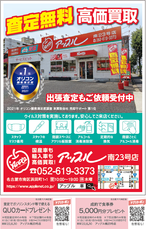 お車のご相談・ 査定だけでもOK! カンタン 入力 30秒 アップルがブランド買取始めました! お電話でも受付中! 受付時間10:00~19:00 052-619-3373 お車のご相談・ 査定だけでもOK! カンタン 入力 30秒 アップルがブランド買取始めました! お電話でも受付中! 受付時間10:00~19:00 052-619-3373 アップルがブランド買取始めました! お電話でも受付中! 受付時間10:00~19:00 052-619-3373 店舗情報 在庫車 スタッフ紹介 ブログ お客様の声 キャンペーン 無料査定 click [ つぶやき ] 2022/05/28 (土) 14:38 オトクなアップルを更にオトクにご利用ください。 こんにちは!本日も元気に営業中です(∩´∀`)∩アップル南23号店のまつしたです。買取車両のクリーニングをする北川さんを激写!その背中になにやら乗っかっています。(ワタシが乗せました)懸命に作業するあまり全く気付かない北川さん…!背中に乗ってて気付かないなんて…ソンナコトアル!?ホンマカァ~!?と思われた皆様…正解です。ちょっと盛っちゃいました(^◇^)「ちょっとそのままで!」とか言いつつ写真撮りましたスミマセン。ワタシが北川さんの背中にそっと乗せたものは…ドン!!【名古屋フリモ南区版6月号】今月もお得なクーポン掲載中でございます。お店の外観がドーンと載ってますのでスグに分かりますヨ(∩´∀`)∩査定だけでもQUOカードがもらえちゃう!ご来店の際はお忘れなく~(∩´∀`)∩皆様のご来店を心よりお待ちしております~! 2022-05-28 14:38:30 新しい記事へ 古い記事へ 最新記事 GW休業のお知らせキャナルリゾートさん牛角さん次回臨時休業のお知らせ本日から営業しております! 店舗情報に戻る 月別アーカイブ 2026年04月(18)2026年03月(22)2026年02月(21)2026年01月(19)2025年12月(15)2025年11月(20)2025年10月(10)2025年09月(5)2025年08月(6)2025年07月(4)2025年06月(3)2025年05月(5)2025年04月(6)2025年03月(5)2025年02月(3)2025年01月(2)2024年12月(2)2024年11月(5)2024年10月(4)2024年09月(9)2024年08月(7)2024年07月(4)2024年06月(4)2024年05月(5)2024年04月(4)2024年03月(4)2024年02月(4)2024年01月(5)2023年12月(5)2023年11月(6)2023年10月(2)2023年09月(5)2023年08月(9)2023年07月(6)2023年06月(6)2023年05月(16)2023年04月(5)2023年03月(5)2023年02月(5)2023年01月(2)2022年12月(6)2022年11月(7)2022年10月(8)2022年09月(5)2022年08月(7)2022年07月(12)2022年06月(8)2022年05月(10)2022年04月(8)2022年03月(5)2022年02月(4)2022年01月(10)2021年12月(12)2021年11月(8)2021年10月(9)2021年09月(9)2021年08月(10)2021年07月(10)2021年06月(4)2021年05月(9)2021年04月(7)2021年03月(2)2021年02月(6)2021年01月(6)2020年12月(7)2020年11月(8)2020年10月(8)2020年09月(7)2020年08月(4)2020年07月(8)2020年06月(8)2020年05月(7)2020年04月(10)2020年03月(7)2020年02月(8)2020年01月(7)2019年12月(8)2019年11月(7)2019年10月(6)2019年09月(7)2019年08月(5)2019年07月(3)2019年06月(4)2019年05月(6)2019年04月(5)2019年03月(5)2019年02月(4)2019年01月(4)2018年12月(3)2018年11月(4)2018年10月(17)2018年09月(25)2018年08月(17)2018年07月(24)2018年06月(25)2018年05月(5)2018年04月(6)2018年03月(7)2018年02月(8)2018年01月(8)2017年12月(8)2017年11月(8)2017年10月(5)2017年09月(7)2017年08月(7)2017年07月(6)2017年06月(4)2017年05月(6)2017年04月(6)2017年03月(4)2017年02月(5)2017年01月(3)2016年12月(6)2016年11月(6)2016年10月(7)2016年09月(4)2016年08月(7)2016年07月(2)2016年06月(3)2016年05月(3)2016年04月(2)2016年02月(2)2016年01月(2)2015年12月(1)2015年10月(2)2015年09月(3)2015年08月(5)2015年07月(3)2015年06月(3)2015年05月(2)2015年04月(2)2015年03月(2)2015年02月(2)2015年01月(4)2014年12月(2)2014年11月(5)2014年10月(5)2014年09月(8)2014年08月(6)2014年07月(4)2014年06月(7)2014年05月(4)2014年04月(7)2014年03月(1)2014年02月(1)2014年01月(2)2013年12月(2)2013年11月(1)2013年10月(1)2013年09月(3)