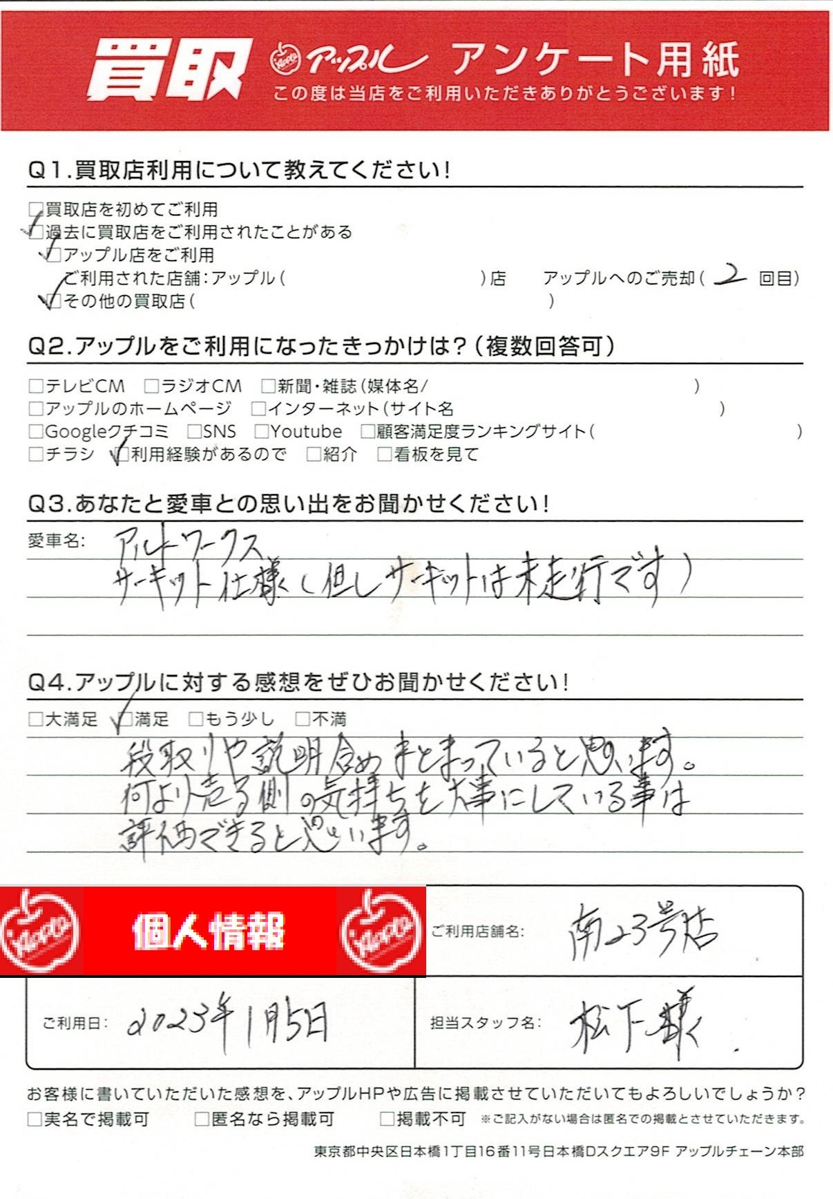 お車のご相談・ 査定だけでもOK! カンタン 入力 30秒 アップルがブランド買取始めました! お電話でも受付中! 受付時間10:00~19:00 052-619-3373 お車のご相談・ 査定だけでもOK! カンタン 入力 30秒 アップルがブランド買取始めました! お電話でも受付中! 受付時間10:00~19:00 052-619-3373 アップルがブランド買取始めました! お電話でも受付中! 受付時間10:00~19:00 052-619-3373 店舗情報 在庫車 スタッフ紹介 ブログ お客様の声 キャンペーン 無料査定 click お客様の声 ご記入日: 2023/01/05 U様 車名:スズキ アルト (2015年12月以降のワークス含む) 段取りや説明含めまとまっていると思います。何より売る側の気持ちを大事にしている事は評価できると思います。 前へ 次へ お客様の声一覧を見る