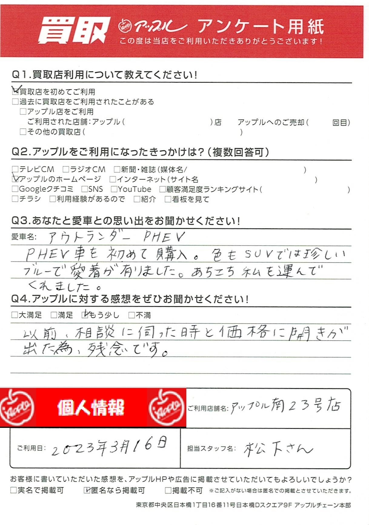 お車のご相談・ 査定だけでもOK! カンタン 入力 30秒 アップルがブランド買取始めました! お電話でも受付中! 受付時間10:00~19:00 052-619-3373 お車のご相談・ 査定だけでもOK! カンタン 入力 30秒 アップルがブランド買取始めました! お電話でも受付中! 受付時間10:00~19:00 052-619-3373 アップルがブランド買取始めました! お電話でも受付中! 受付時間10:00~19:00 052-619-3373 店舗情報 在庫車 スタッフ紹介 ブログ お客様の声 キャンペーン 無料査定 click お客様の声 ご記入日: 2023/03/16 G様 車名:三菱 アウトランダーPHEV 以前、相談に伺った時と価格に開きが出た為、残念です。 前へ 次へ お客様の声一覧を見る