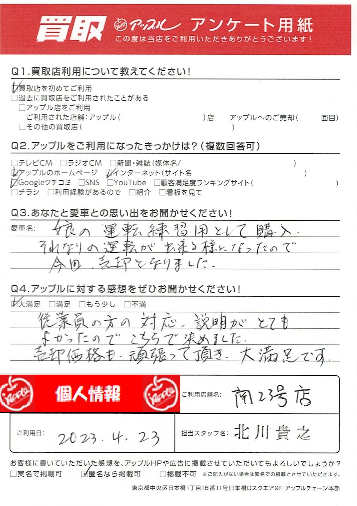 お車のご相談・ 査定だけでもOK! カンタン 入力 30秒 アップルがブランド買取始めました! お電話でも受付中! 受付時間10:00~19:00 052-619-3373 お車のご相談・ 査定だけでもOK! カンタン 入力 30秒 アップルがブランド買取始めました! お電話でも受付中! 受付時間10:00~19:00 052-619-3373 アップルがブランド買取始めました! お電話でも受付中! 受付時間10:00~19:00 052-619-3373 店舗情報 在庫車 スタッフ紹介 ブログ お客様の声 キャンペーン 無料査定 click お客様の声 ご記入日: 2023/04/23 S様 従業員の方の対応、説明が とてもよかったので こちらで決めました。売却価格も、頑張って頂き、大満足です。 前へ 次へ お客様の声一覧を見る