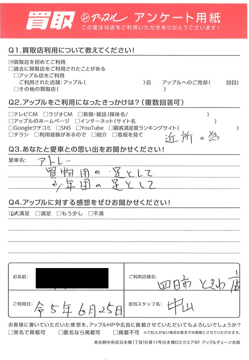 お車のご相談・ 査定だけでもOK! カンタン 入力 30秒 アップルがブランド買取始めました! お電話でも受付中! 受付時間10:00 ~ 18:30 0120-174-177 お車のご相談・ 査定だけでもOK! カンタン 入力 30秒 アップルがブランド買取始めました! お電話でも受付中! 受付時間10:00 ~ 18:30 0120-174-177 アップルがブランド買取始めました! お電話でも受付中! 受付時間10:00 ~ 18:30 0120-174-177 店舗情報 在庫車 スタッフ紹介 ブログ お客様の声 キャンペーン お得 無料査定 click お客様の声 ご記入日: 2023/06/25 A様 車名:ダイハツ アトレー 買いもの用の足として少年団の足として 前へ 次へ お客様の声一覧を見る