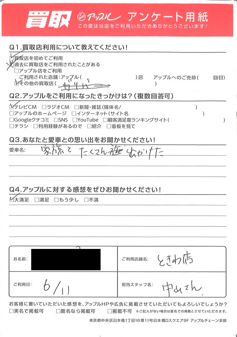 お車のご相談・ 査定だけでもOK! カンタン 入力 30秒 アップルがブランド買取始めました! お電話でも受付中! 受付時間10:00 ~ 18:30 0120-174-177 お車のご相談・ 査定だけでもOK! カンタン 入力 30秒 アップルがブランド買取始めました! お電話でも受付中! 受付時間10:00 ~ 18:30 0120-174-177 アップルがブランド買取始めました! お電話でも受付中! 受付時間10:00 ~ 18:30 0120-174-177 店舗情報 在庫車 スタッフ紹介 ブログ お客様の声 キャンペーン お得 無料査定 click お客様の声 ご記入日: 2023/06/11 T様 車名:トヨタ ハリアー (H25年12月~のハイブリッド含む) 家族とたくさん出かけた 前へ 次へ お客様の声一覧を見る
