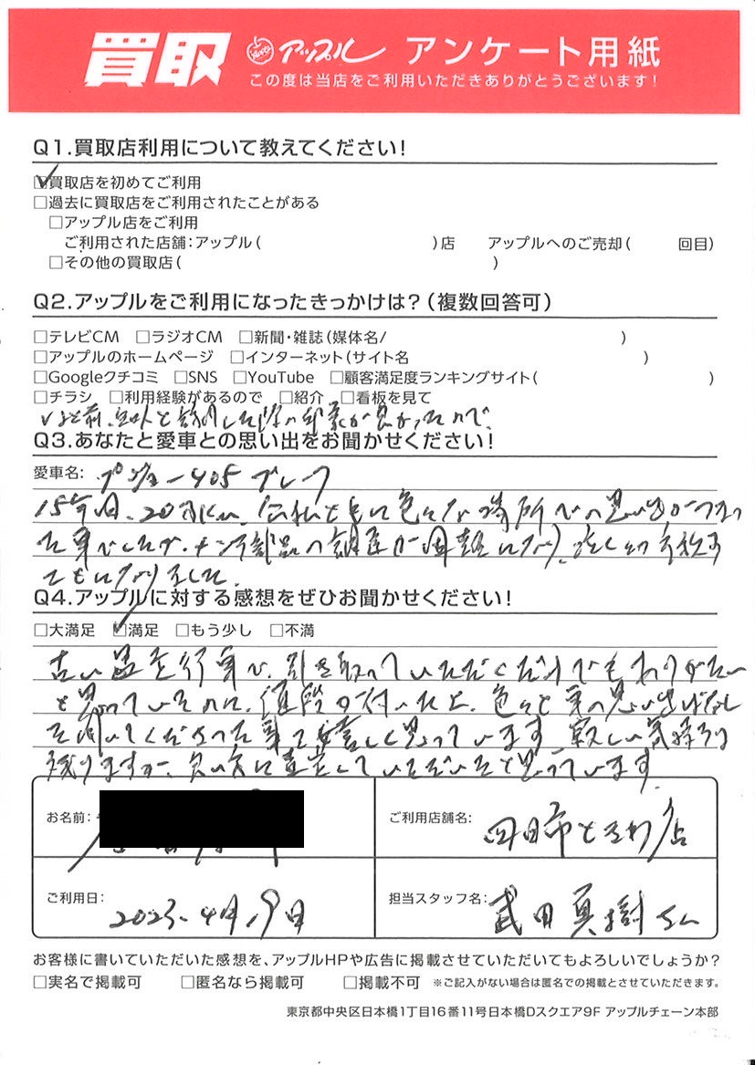 お車のご相談・ 査定だけでもOK! カンタン 入力 30秒 アップルがブランド買取始めました! お電話でも受付中! 受付時間10:00 ~ 18:30 0120-174-177 お車のご相談・ 査定だけでもOK! カンタン 入力 30秒 アップルがブランド買取始めました! お電話でも受付中! 受付時間10:00 ~ 18:30 0120-174-177 アップルがブランド買取始めました! お電話でも受付中! 受付時間10:00 ~ 18:30 0120-174-177 店舗情報 在庫車 スタッフ紹介 ブログ お客様の声 キャンペーン お得 無料査定 click お客様の声 ご記入日: 2023/04/19 H様 車名:プジョー 405ブレーク 古い過走行車で、引き取っていただくだけでもありがたいと思っていたのに、値段が付いた上、色々と車の思い出ばなしを聞いてくださった事を嬉しく思っています。寂しい気持ちは残りますが、良い方に査定していただいたと思っています。 前へ 次へ お客様の声一覧を見る