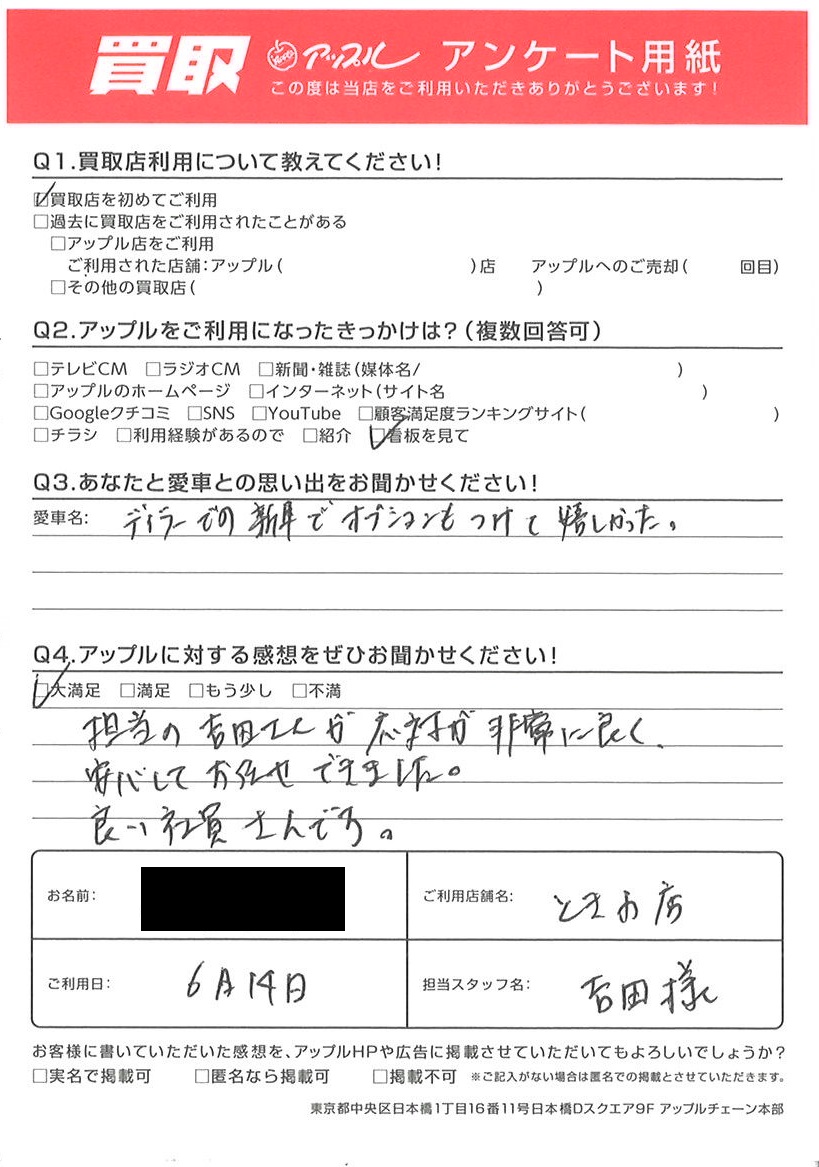 お車のご相談・ 査定だけでもOK! カンタン 入力 30秒 アップルがブランド買取始めました! お電話でも受付中! 受付時間10:00 ~ 18:30 0120-174-177 お車のご相談・ 査定だけでもOK! カンタン 入力 30秒 アップルがブランド買取始めました! お電話でも受付中! 受付時間10:00 ~ 18:30 0120-174-177 アップルがブランド買取始めました! お電話でも受付中! 受付時間10:00 ~ 18:30 0120-174-177 店舗情報 在庫車 スタッフ紹介 ブログ お客様の声 キャンペーン お得 無料査定 click お客様の声 ご記入日: 2023/06/14 Y様 車名:トヨタ プリウス(2023年3月~のPHVを含む) 担当の吉田さんが応対が非常に良く、安心してお預けできました。良い社員さんです。 前へ 次へ お客様の声一覧を見る