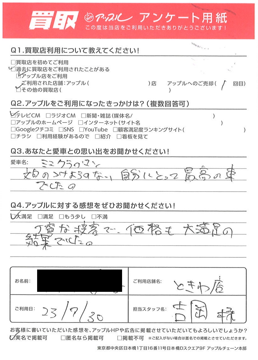 お車のご相談・ 査定だけでもOK! カンタン 入力 30秒 アップルがブランド買取始めました! お電話でも受付中! 受付時間10:00 ~ 18:30 0120-174-177 お車のご相談・ 査定だけでもOK! カンタン 入力 30秒 アップルがブランド買取始めました! お電話でも受付中! 受付時間10:00 ~ 18:30 0120-174-177 アップルがブランド買取始めました! お電話でも受付中! 受付時間10:00 ~ 18:30 0120-174-177 店舗情報 在庫車 スタッフ紹介 ブログ お客様の声 キャンペーン お得 無料査定 click お客様の声 ご記入日: 2023/07/30 M様 車名:ミニ ミニクラブマン 丁寧な接客で価格も大満足の結果でした。 前へ 次へ お客様の声一覧を見る