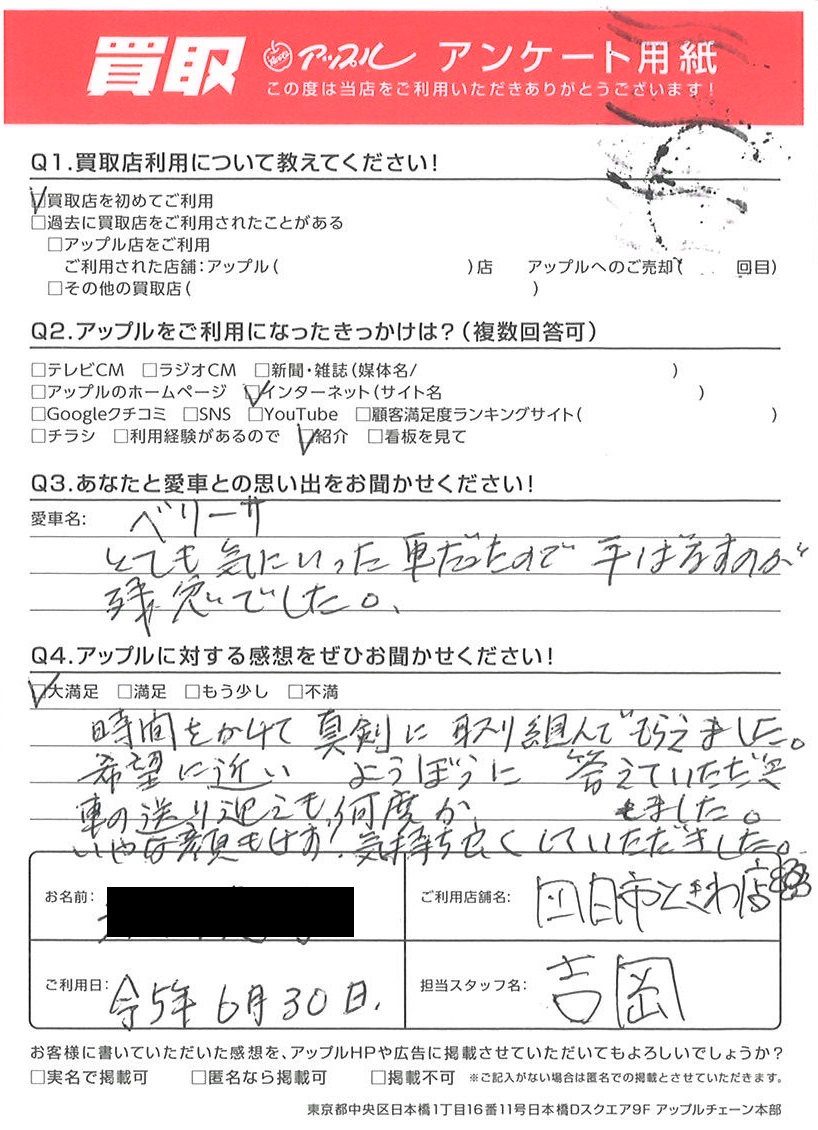 お車のご相談・ 査定だけでもOK! カンタン 入力 30秒 アップルがブランド買取始めました! お電話でも受付中! 受付時間10:00 ~ 18:30 0120-174-177 お車のご相談・ 査定だけでもOK! カンタン 入力 30秒 アップルがブランド買取始めました! お電話でも受付中! 受付時間10:00 ~ 18:30 0120-174-177 アップルがブランド買取始めました! お電話でも受付中! 受付時間10:00 ~ 18:30 0120-174-177 店舗情報 在庫車 スタッフ紹介 ブログ お客様の声 キャンペーン お得 無料査定 click お客様の声 ご記入日: 2023/06/30 S様 車名:マツダ ベリーサ 時間をかけて真剣に取り組んでもらえました。希望に近い ようぼうに 答えていただき車の送り迎えも何度か もました。いやな顔もせず!気持ち良くしていただきました。 前へ 次へ お客様の声一覧を見る