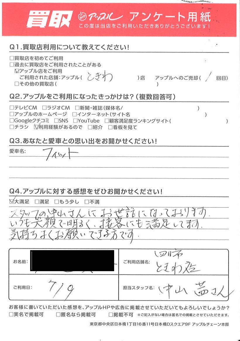 お車のご相談・ 査定だけでもOK! カンタン 入力 30秒 アップルがブランド買取始めました! お電話でも受付中! 受付時間10:00 ~ 18:30 0120-174-177 お車のご相談・ 査定だけでもOK! カンタン 入力 30秒 アップルがブランド買取始めました! お電話でも受付中! 受付時間10:00 ~ 18:30 0120-174-177 アップルがブランド買取始めました! お電話でも受付中! 受付時間10:00 ~ 18:30 0120-174-177 店舗情報 在庫車 スタッフ紹介 ブログ お客様の声 キャンペーン お得 無料査定 click お客様の声 ご記入日: 2023/07/09 W様 車名:ホンダ フィット(H25年9月以降のハイブリッド含む) スタッフの中山さんにお世話になっております。いつも笑顔で明るく、接客にも満足してます。気持ちよくお願いできる方です。 前へ 次へ お客様の声一覧を見る