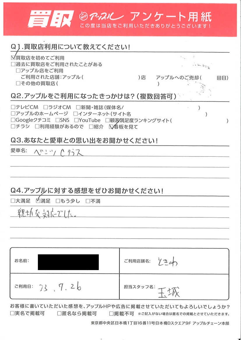 お車のご相談・ 査定だけでもOK! カンタン 入力 30秒 アップルがブランド買取始めました! お電話でも受付中! 受付時間10:00 ~ 18:30 0120-174-177 お車のご相談・ 査定だけでもOK! カンタン 入力 30秒 アップルがブランド買取始めました! お電話でも受付中! 受付時間10:00 ~ 18:30 0120-174-177 アップルがブランド買取始めました! お電話でも受付中! 受付時間10:00 ~ 18:30 0120-174-177 店舗情報 在庫車 スタッフ紹介 ブログ お客様の声 キャンペーン お得 無料査定 click お客様の声 ご記入日: 2023/07/26 Y様 車名:メルセデス・ベンツ Cクラス 親切な対応でした。 前へ 次へ お客様の声一覧を見る