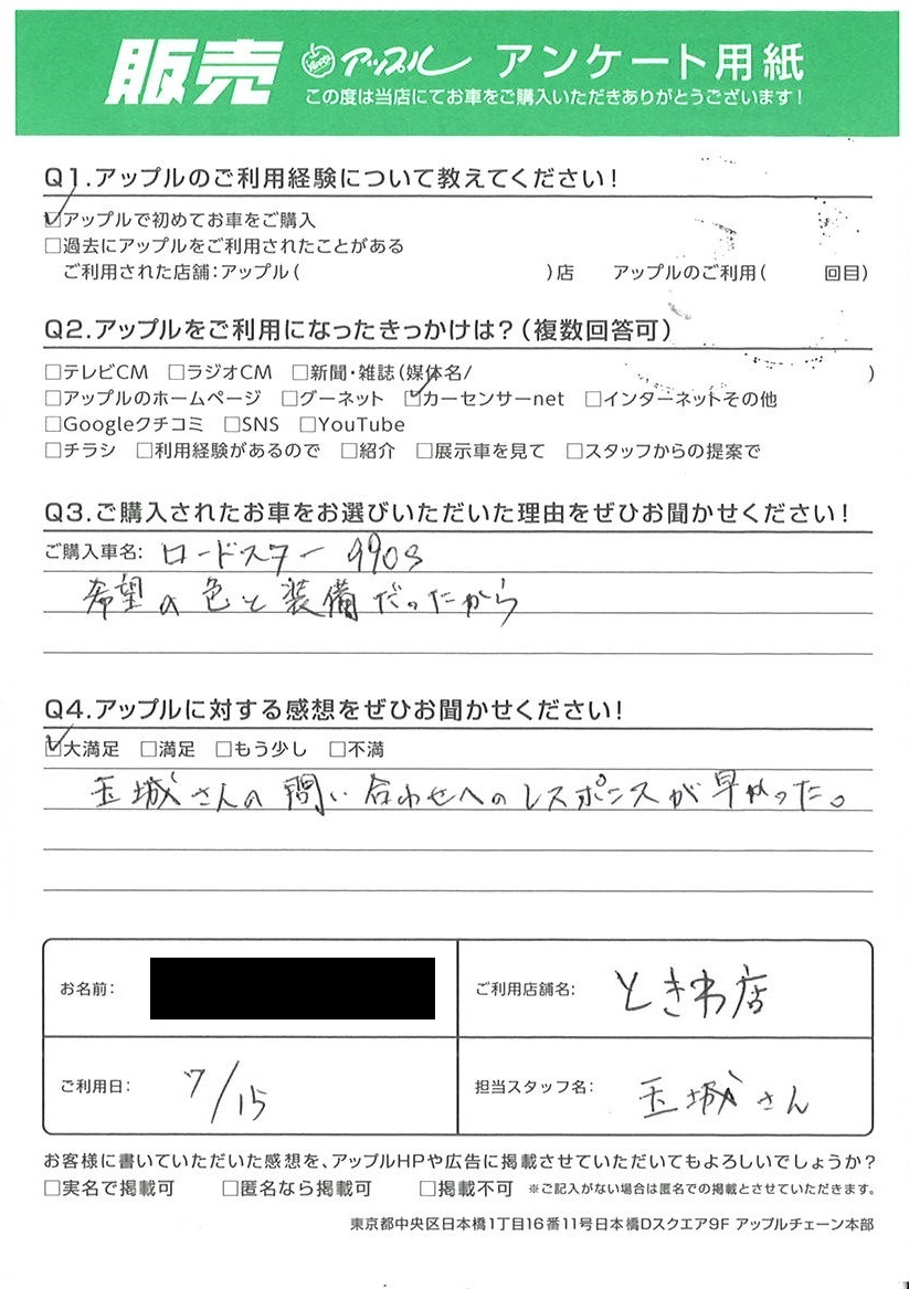 お車のご相談・ 査定だけでもOK! カンタン 入力 30秒 アップルがブランド買取始めました! お電話でも受付中! 受付時間10:00 ~ 18:30 0120-174-177 お車のご相談・ 査定だけでもOK! カンタン 入力 30秒 アップルがブランド買取始めました! お電話でも受付中! 受付時間10:00 ~ 18:30 0120-174-177 アップルがブランド買取始めました! お電話でも受付中! 受付時間10:00 ~ 18:30 0120-174-177 店舗情報 在庫車 スタッフ紹介 ブログ お客様の声 キャンペーン お得 無料査定 click お客様の声 ご記入日: 2023/07/15 K様 車名:マツダ ロードスター 玉城さんの問い合わせへのレスポンスが早かった。 前へ 次へ お客様の声一覧を見る