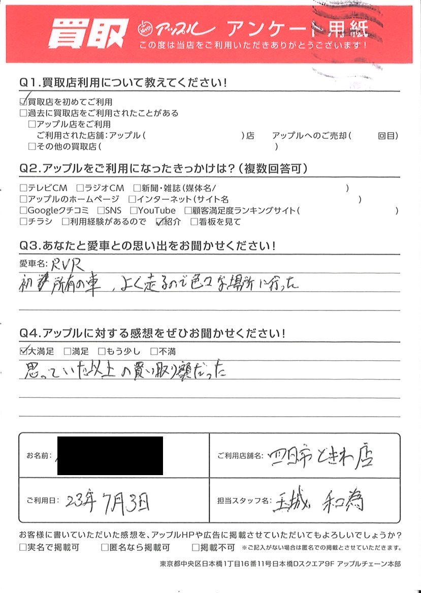 お車のご相談・ 査定だけでもOK! カンタン 入力 30秒 アップルがブランド買取始めました! お電話でも受付中! 受付時間10:00 ~ 18:30 0120-174-177 お車のご相談・ 査定だけでもOK! カンタン 入力 30秒 アップルがブランド買取始めました! お電話でも受付中! 受付時間10:00 ~ 18:30 0120-174-177 アップルがブランド買取始めました! お電話でも受付中! 受付時間10:00 ~ 18:30 0120-174-177 店舗情報 在庫車 スタッフ紹介 ブログ お客様の声 キャンペーン お得 無料査定 click お客様の声 ご記入日: 2023/07/03 I様 車名:三菱 RVR 思っていた以上の買い取り額だった。 前へ 次へ お客様の声一覧を見る