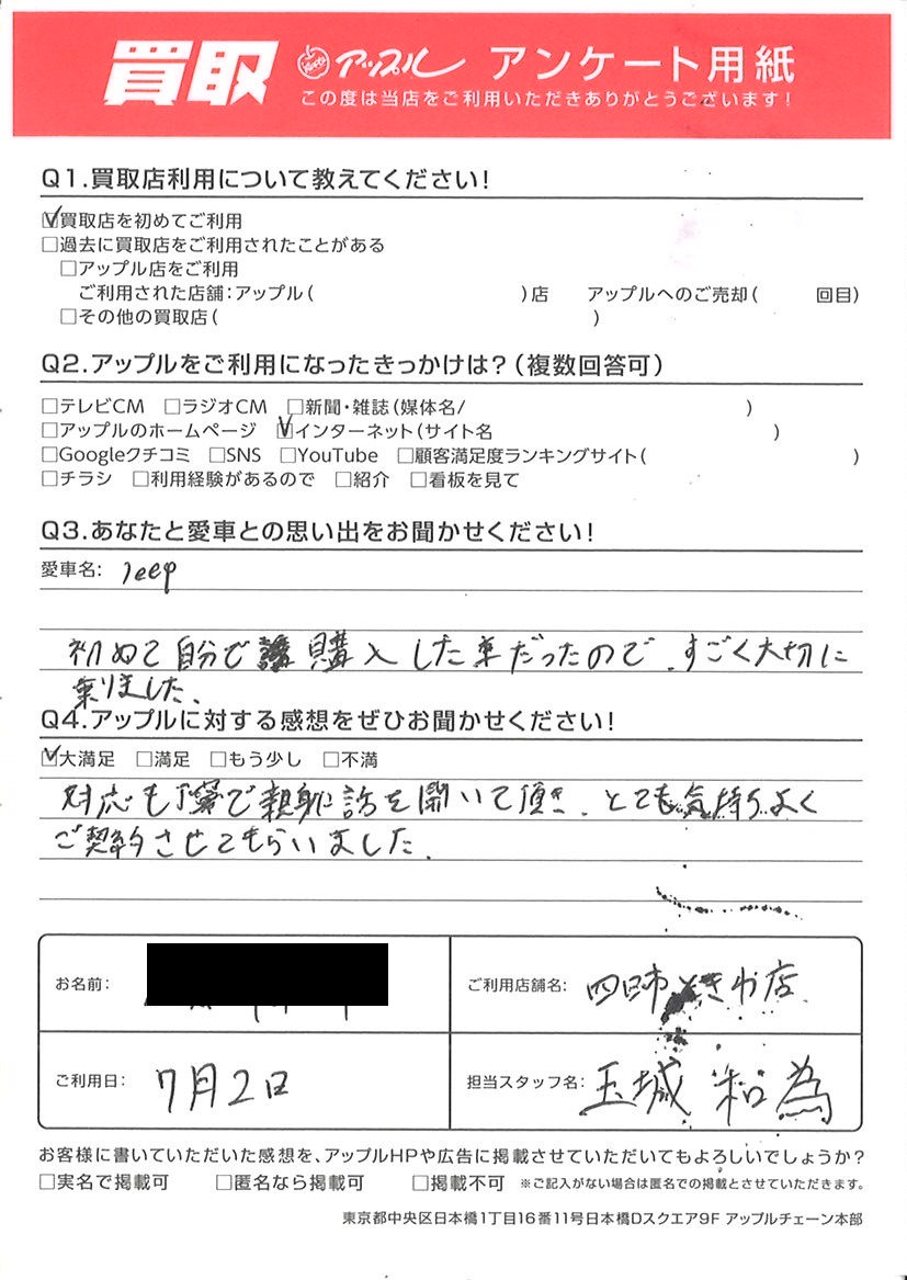 お車のご相談・ 査定だけでもOK! カンタン 入力 30秒 アップルがブランド買取始めました! お電話でも受付中! 受付時間10:00 ~ 18:30 0120-174-177 お車のご相談・ 査定だけでもOK! カンタン 入力 30秒 アップルがブランド買取始めました! お電話でも受付中! 受付時間10:00 ~ 18:30 0120-174-177 アップルがブランド買取始めました! お電話でも受付中! 受付時間10:00 ~ 18:30 0120-174-177 店舗情報 在庫車 スタッフ紹介 ブログ お客様の声 キャンペーン お得 無料査定 click お客様の声 ご記入日: 2023/07/02 Y様 車名:ジープ ラングラー 対応も丁寧で親身に話を聞いて頂き、とても気持ちよくご契約させてもらいました。 前へ 次へ お客様の声一覧を見る