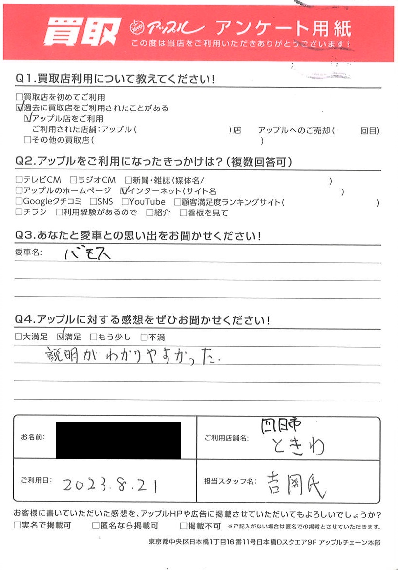 お車のご相談・ 査定だけでもOK! カンタン 入力 30秒 アップルがブランド買取始めました! お電話でも受付中! 受付時間10:00 ~ 18:30 0120-174-177 お車のご相談・ 査定だけでもOK! カンタン 入力 30秒 アップルがブランド買取始めました! お電話でも受付中! 受付時間10:00 ~ 18:30 0120-174-177 アップルがブランド買取始めました! お電話でも受付中! 受付時間10:00 ~ 18:30 0120-174-177 店舗情報 在庫車 スタッフ紹介 ブログ お客様の声 キャンペーン お得 無料査定 click お客様の声 ご記入日: 2023/08/21 H様 車名:ホンダ バモス 説明がわかりやすかった。 前へ 次へ お客様の声一覧を見る