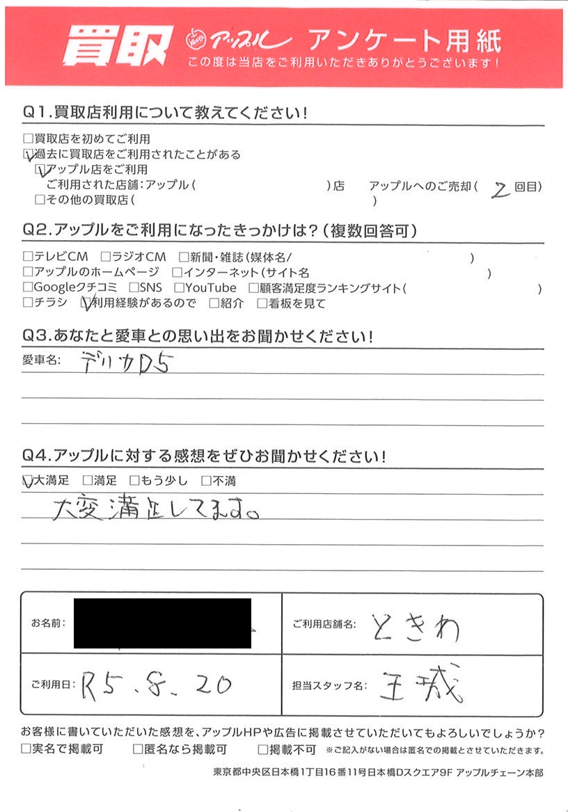 お車のご相談・ 査定だけでもOK! カンタン 入力 30秒 アップルがブランド買取始めました! お電話でも受付中! 受付時間10:00 ~ 18:30 0120-174-177 お車のご相談・ 査定だけでもOK! カンタン 入力 30秒 アップルがブランド買取始めました! お電話でも受付中! 受付時間10:00 ~ 18:30 0120-174-177 アップルがブランド買取始めました! お電話でも受付中! 受付時間10:00 ~ 18:30 0120-174-177 店舗情報 在庫車 スタッフ紹介 ブログ お客様の声 キャンペーン お得 無料査定 click お客様の声 ご記入日: 2023/08/20 H様 車名:三菱 デリカD:5 大変満足してます。 前へ 次へ お客様の声一覧を見る